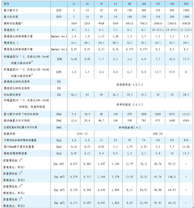 HSE系列蝸輪絲桿升降機提升力能5-1000KN,絲桿直徑18-120mm,輸入功率0.6-18KW,傳動效率30%-40%,結構形式分為絲桿往返運動和螺母往返運動兩種,具體性能參數見下表: