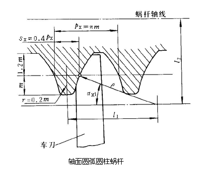圓弧圓柱蝸桿減速機齒面是由蝸桿軸面內一段凹圓弧繞蝸桿軸線作螺旋運動而形成的螺旋面,可以用凸圓弧車刀將前刃面置于蝸桿軸面內車出螺旋面,